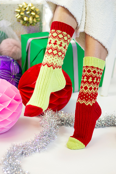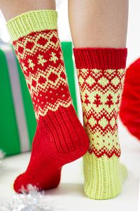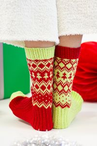 Merry and bright, the Holiday Elf Socks are inspired by the festive outfits we imagine each little elf is wearing as they busily build toys in the North Pole! Vibrant hues of red and green, inverted color schemes, and mini trees make these cute and cuddly socks all the more enticing! Worked up in our soft, sturdy Uni Merino, the stitches are crisp and the colorwork simply pops. These special socks will keep your tootsies warm for years to come!
