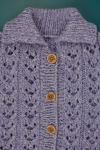 This cardigan is knit flat in pieces from the bottom up and seamed. Stitches for the collar and button band are picked up during finishing and worked flat.